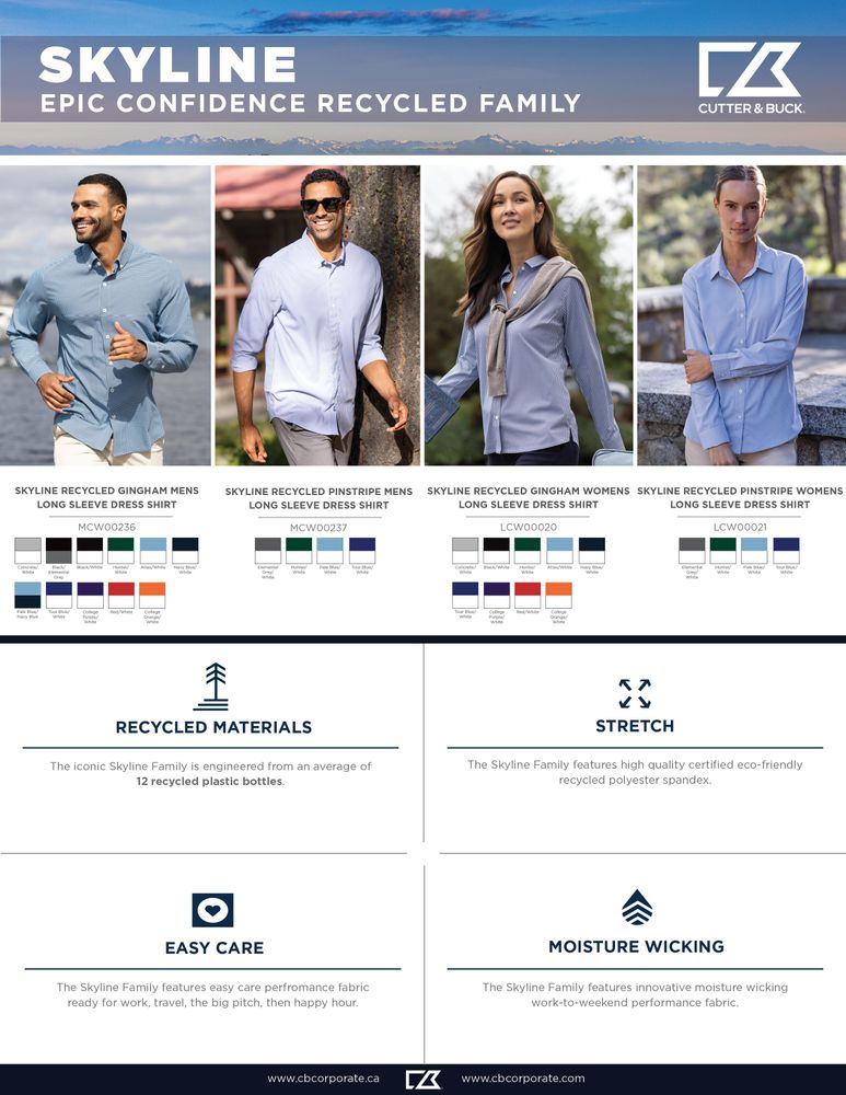 The iconic Skyline Epic Confidence Recycled Gingham Mens Long Sleeve Dress Shirt is engineered with innovative work-to-weekend performance fabric for exceptional versatility. Crafted to instill confidence, and engineered with high quality certified eco-friendly recycled polyester spandex weave for lightweight comfort and breathability, the Skyline will be your favorite mens patterned long sleeve dress shirt for work, travel, the big pitch, then happy hour. With the Skyline's PFAS free stain resistant finish and all-day recovery, you'll look and feel ready to create the next big thing.
