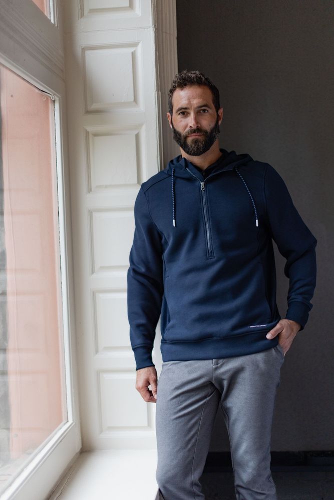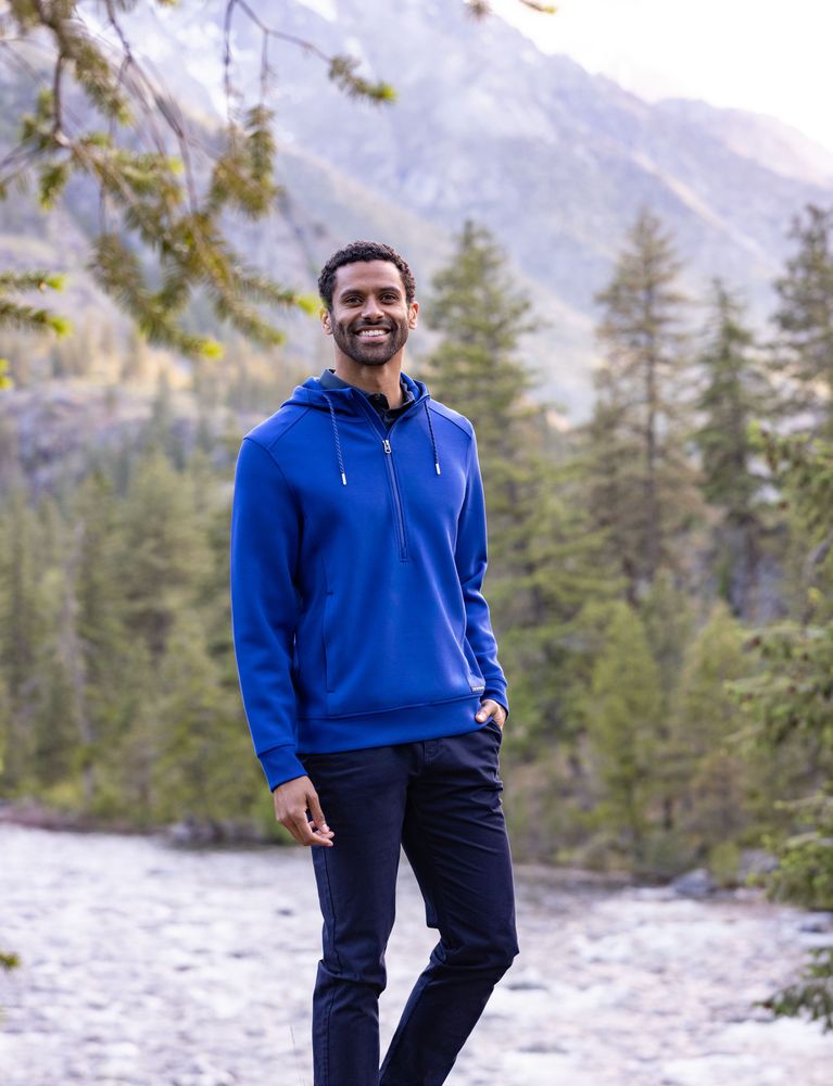 The iconic Roam Epic Versatility Recycled Half Zip Hooded Pullover is engineered for exceptional versatility, designed as your favorite year round mens pullover for your active life: work, golf, tennis, travel, or any everyday adventure. We created this half zip pullover hoodie with high quality certified eco-friendly recycled polyester, rayon and double knit spandex to ensure unparalleled comfort and performance providing a soft, lightweight warmth for year round layering so you can do more for you and your planet.