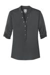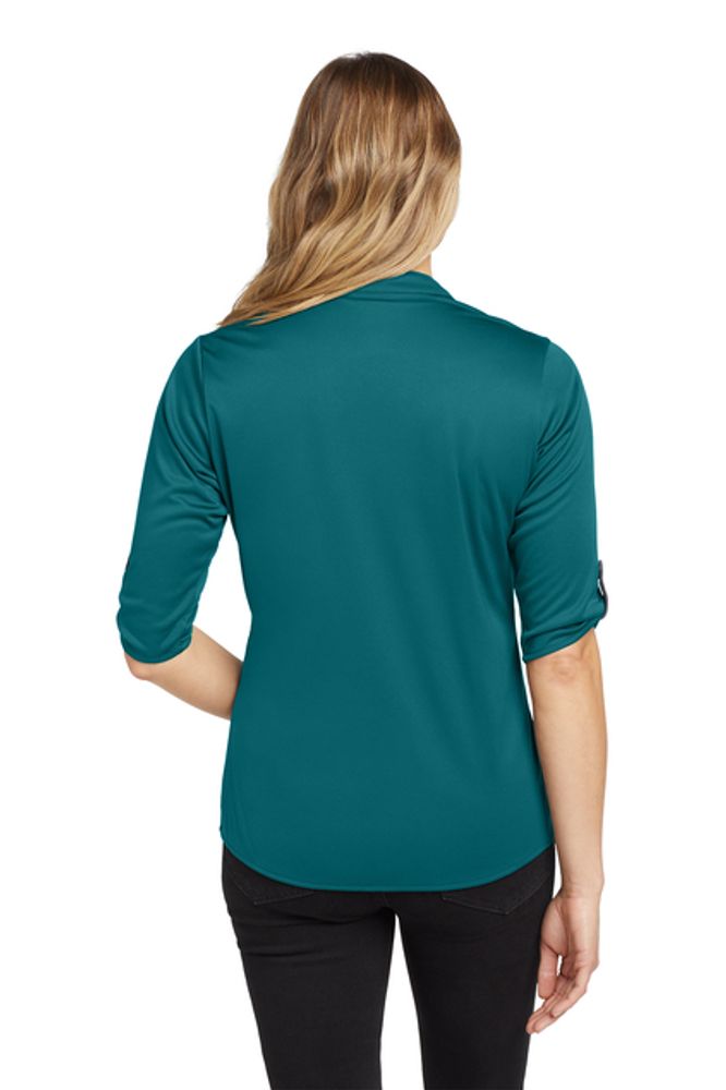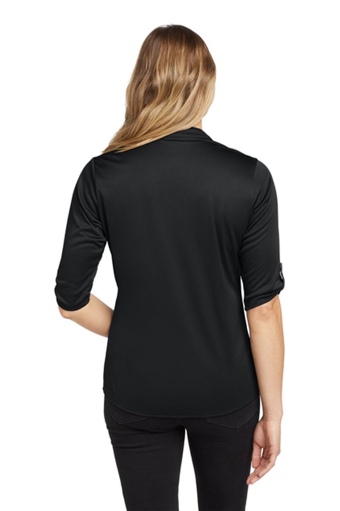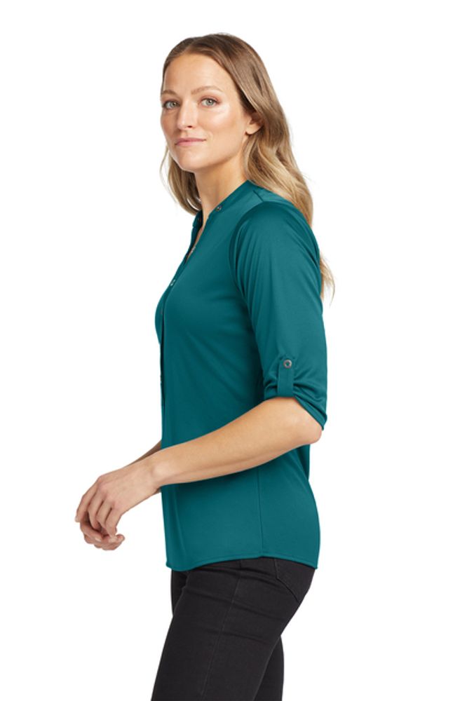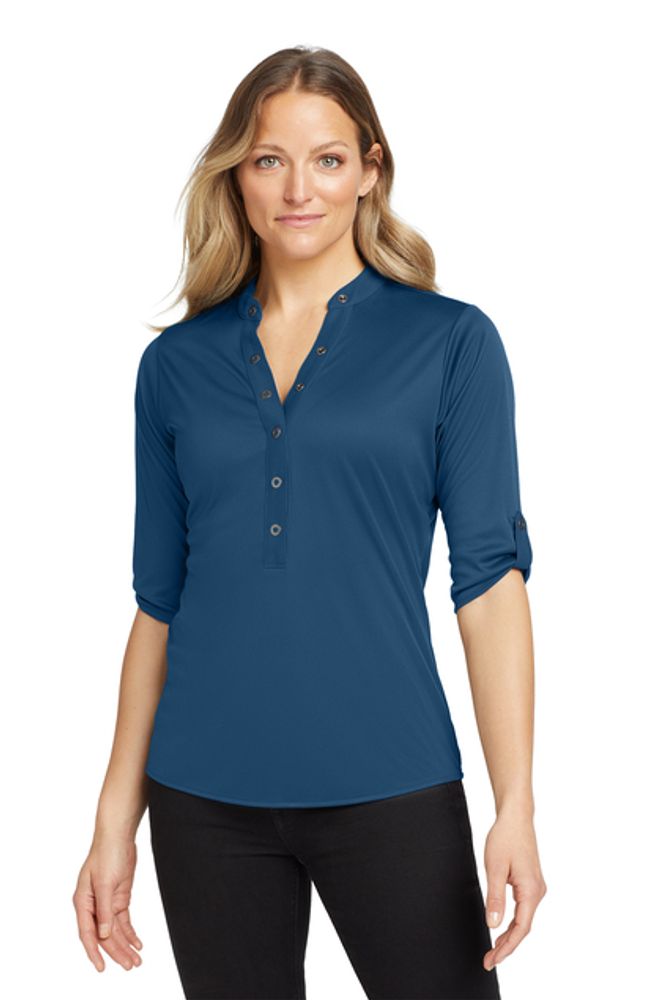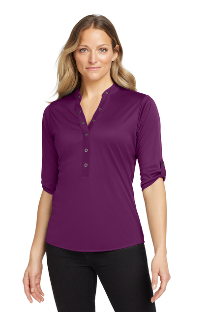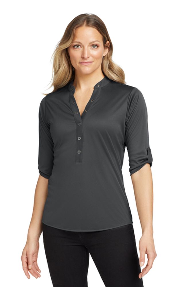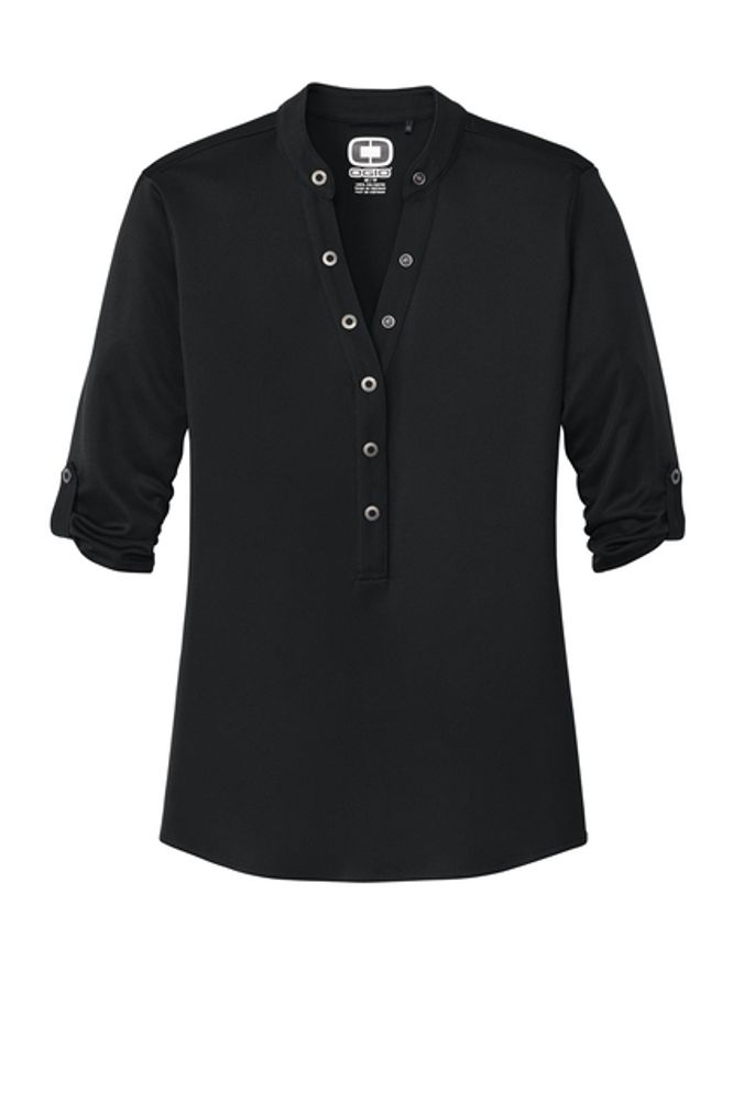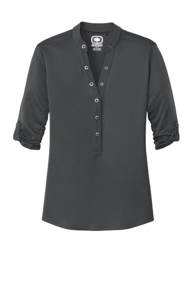 With its 3/4 sleeves and unique sleeve tabs you'll have a crush on this innovative OGIO henley. 4.9-ounce 100% poly interlock with stay-cool wicking technology OGIO heat transfer label for tag-free comfort 6-snap pique placket with OGIO-debossed ring snaps Pique sleeve tabs with OGIO-debossed ring snaps