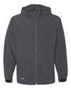 100% polyester, all season soft shell ; Wind resistant ; Water resistant, DWR finish ; Breathable ;4-way stretch ; Media port ; Adjustable three-piece hood designed to contour for a comfortable fit; Zippered chest and hand pockets; Adjustable cuff ; Adjustable hem; Auto lock zipper with easy grab puller; Media port;